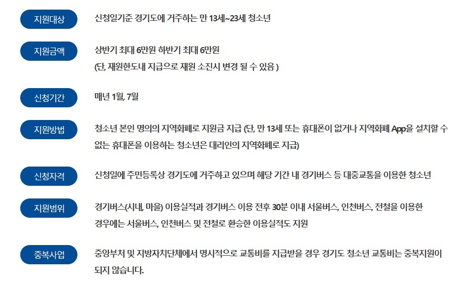 신청일 기준으로 경기도에 거주하는 만 13세에서 만 23세 청소년 생년월일 기준으로는 1999.01.02~ 2010.06.30일까지 해당하는 청소년이면 지원을 받을 수 있습니다. 단, 청소년 본인의 명의 교통카드(지역화폐)만 지원되니 참고하세요.
