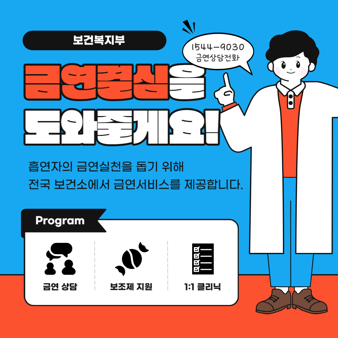 해마다 흡연인구가 늘고 있습니다. 흡연 연령이 해마다 낮아지고 있어 특히 성장기 미성년자에게는 건강에 안좋은 영향이 성인보다는 몇배나 높다고 합니다. 이에 국가적 차원에서 전국 보건소 및 각 지자체에서 금연을 하고 싶지만 현실적으로 어려움을 겪는 국민들에게 보건복지부 주관으로 금연지원 서비스를 제공하고 있습니다.