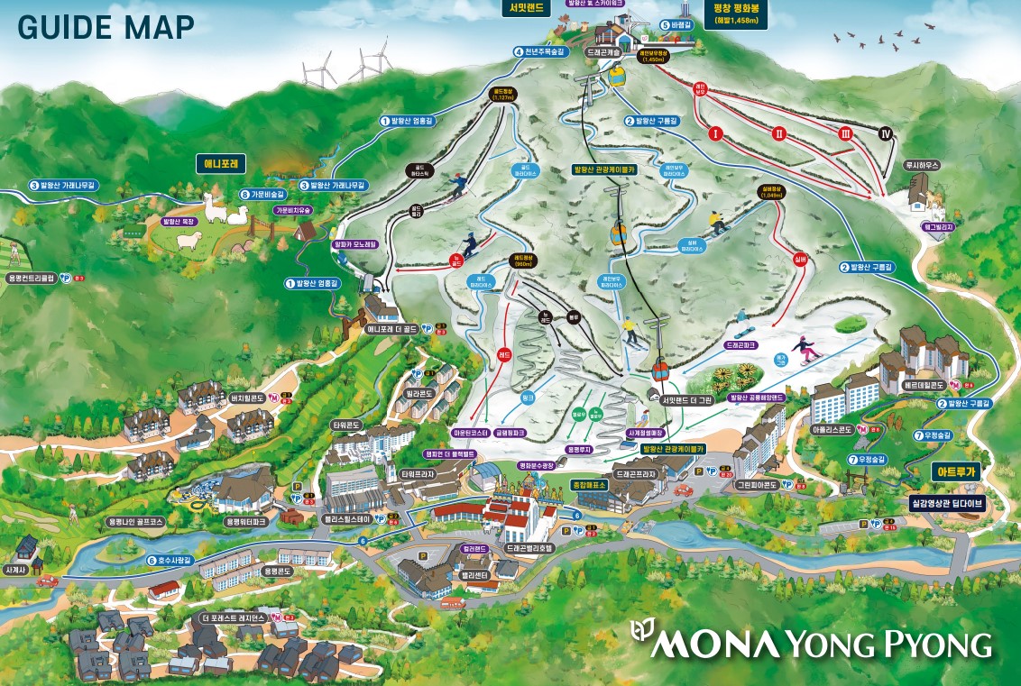 스키뿐만 아니라 골프, 리조트,워터파크등 송어와 자연송이의 지역특색의 먹거리, 즐길거리등 다양한 모나파크 용평리조트는 가족단위로도 많이 찾는 곳이기도 합니다.