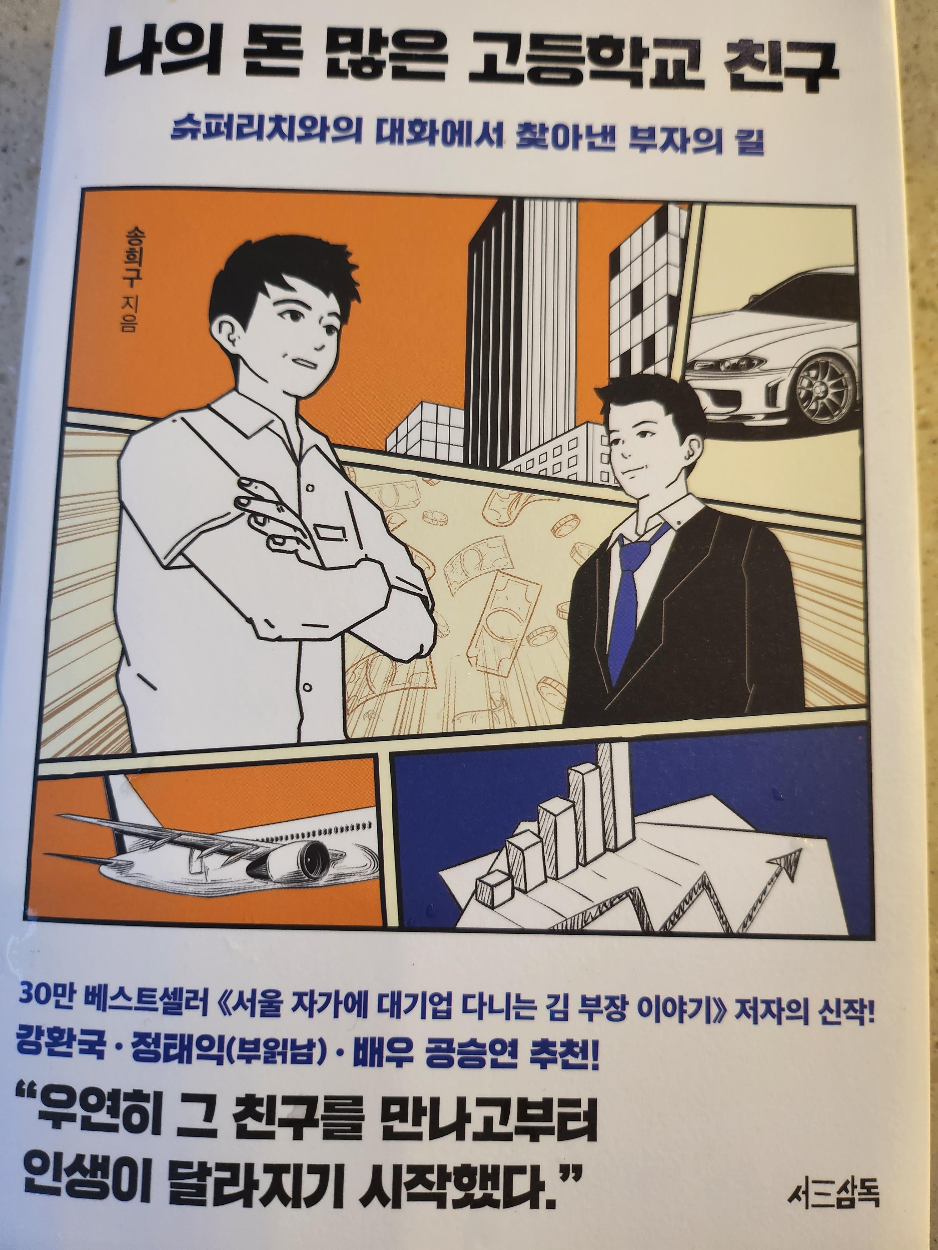 베스트 셀러였던 '서울 자가에 다니는 김 부장 이야기'저자인 신작이면서 부읽남, 배우 공승연까지 강력 추천했던 책입니다. 읽다보면 '부자 아빠 가난한 아빠'와 비슷하다는 느낌이 들기도 합니다. 그러나 한국사람의 마음을 제일 잘 읽어내 소설식으로 써내려간 내용이 어느새 끝장에 다가올 정도로 쉽게 읽히기도 하는 책입니다.