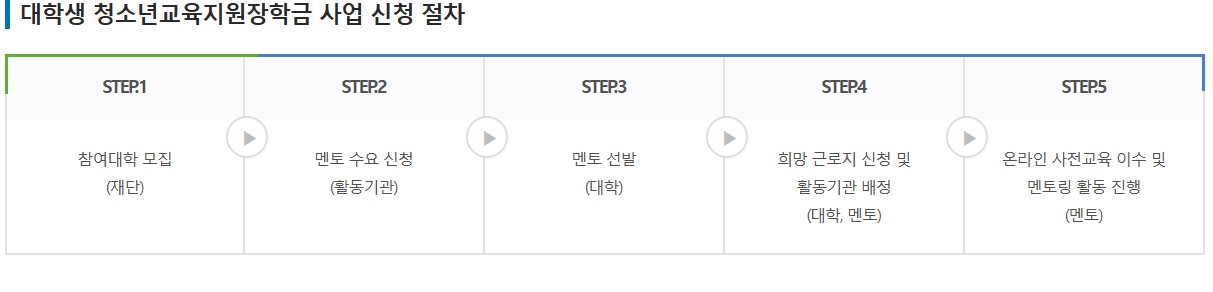 안타깝게도 전국 모든 대학이 실시하지 않습니다. 우선 재단을 통하여 참여대학을 모집합니다; 대학생인 경우 본인의 대학이 해당여부를 확인하셔서 신청하시기 바랍니다. 멘토의 수요 및 선발을 한 후 희망하는 근로지를 신청합니다. 배정 받은 후 온라인으로 사전교육을 받으신 후 멘토로 활동 할 수 있습니다.