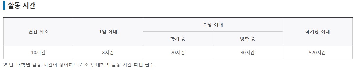 해당하는 대학의 활동 시간이 다를 수 있으니 꼭 확인하셔야 합니다. 연간 최소 10시간이니 다른 활동을 하는 대학생이라면 시간 배분하기 좋을 것 같습니다. 아울러 방학중에는 더 많은 교육근로를 하실 수 있습니다. 학기당 최대 520시간이 한정되어 있으니 참고하시면 되겠습니다.