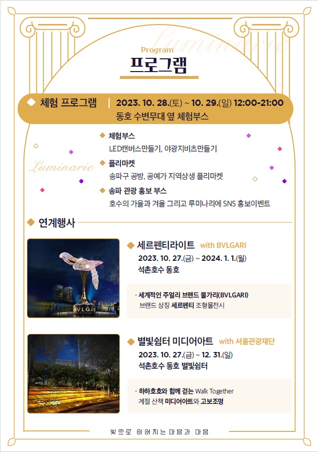 특히 올해에는 세계적인 명품 보석 주얼리 불가리의 협업을 통하여 불가리의 상징인 세르펜티라이트가 석촌호수 동호에 설치되어 루미나리 축제에 신비한 빛을 더할 것입니다.