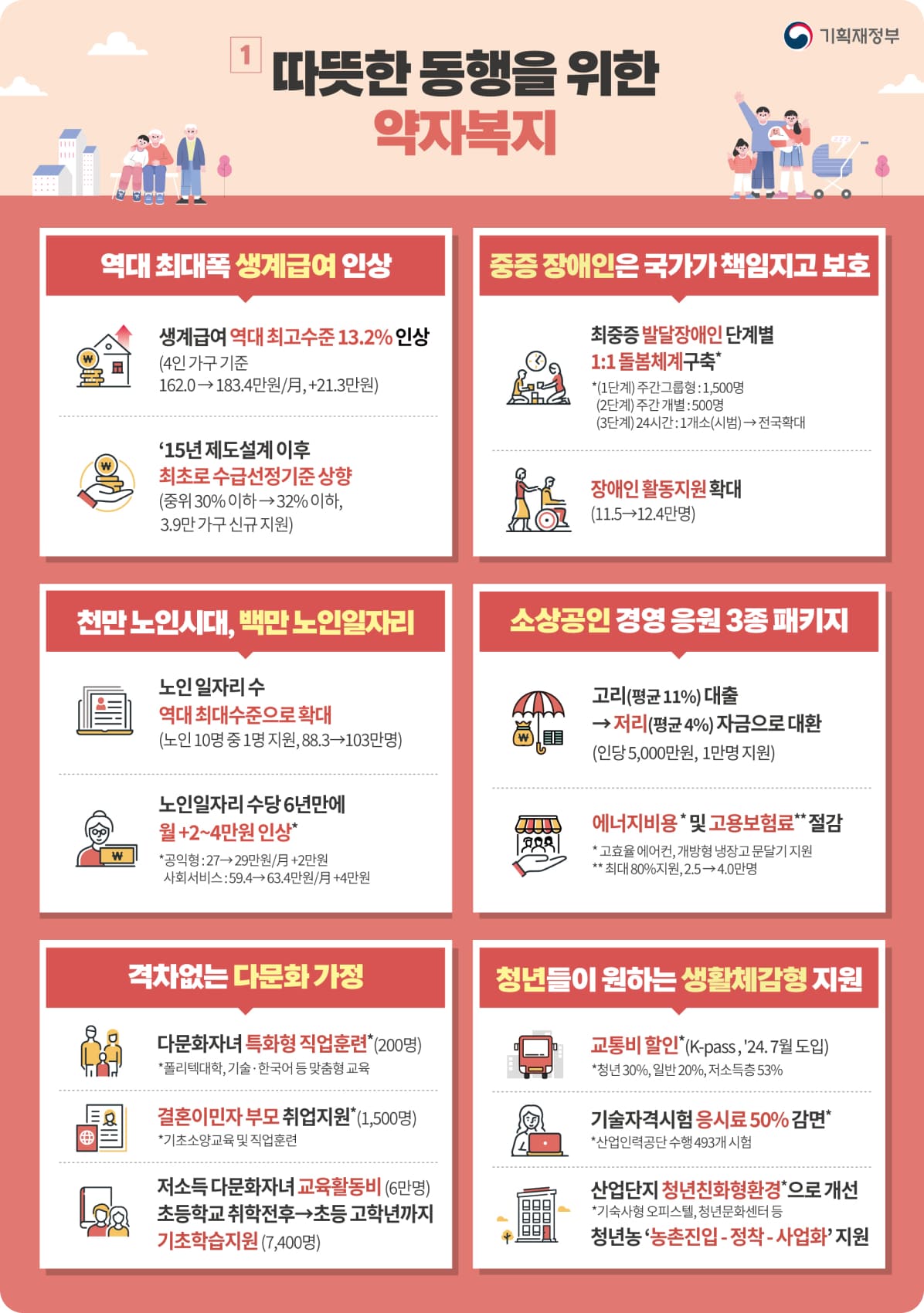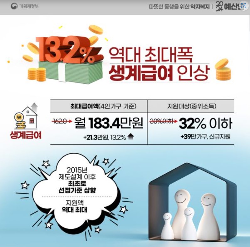 정부는 '필요한 대상에게 두터운 지원을' 이라는 표현을 자주 써왔습니다. 어려운 기초 생활수급자와 차상위 계층, 장애인등 취약계층에게 지원해서 기본 생활의 유지를 목표로 하고 있습니다. 2024년도 복지 예산은 112조 4538억 원으로 올해 대비 12.2% 증가, 정부 총지출 증가율보다 4배 높은 수준인 것이라는 점에 비춰 봤을 때 복지 관련 지출이 큰 폭으로 증가했다고 볼 수 있습니다.